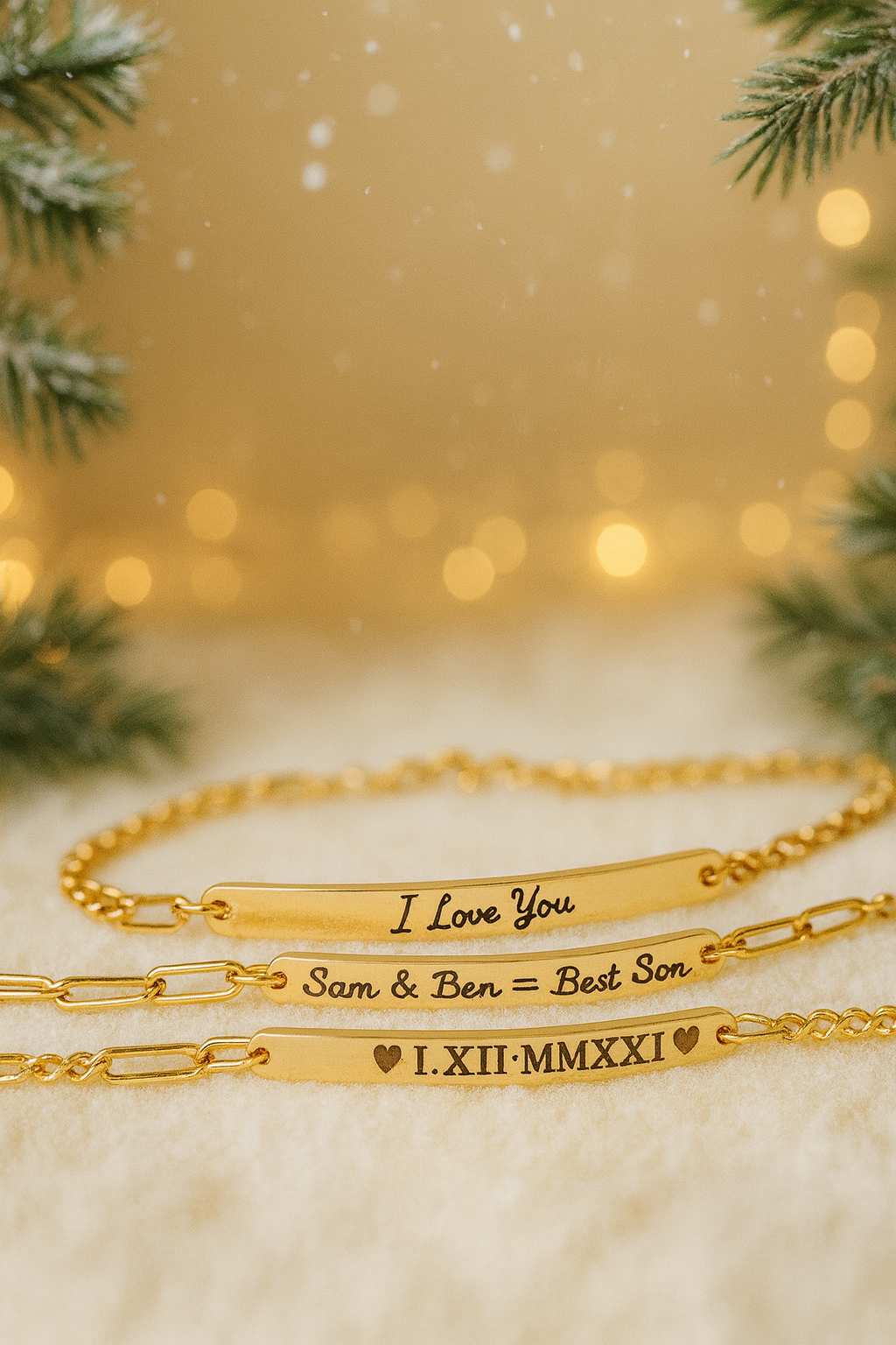 personalized bar bracelets, delicate everyday chains, sentimental engravings, and minimalist essentials.