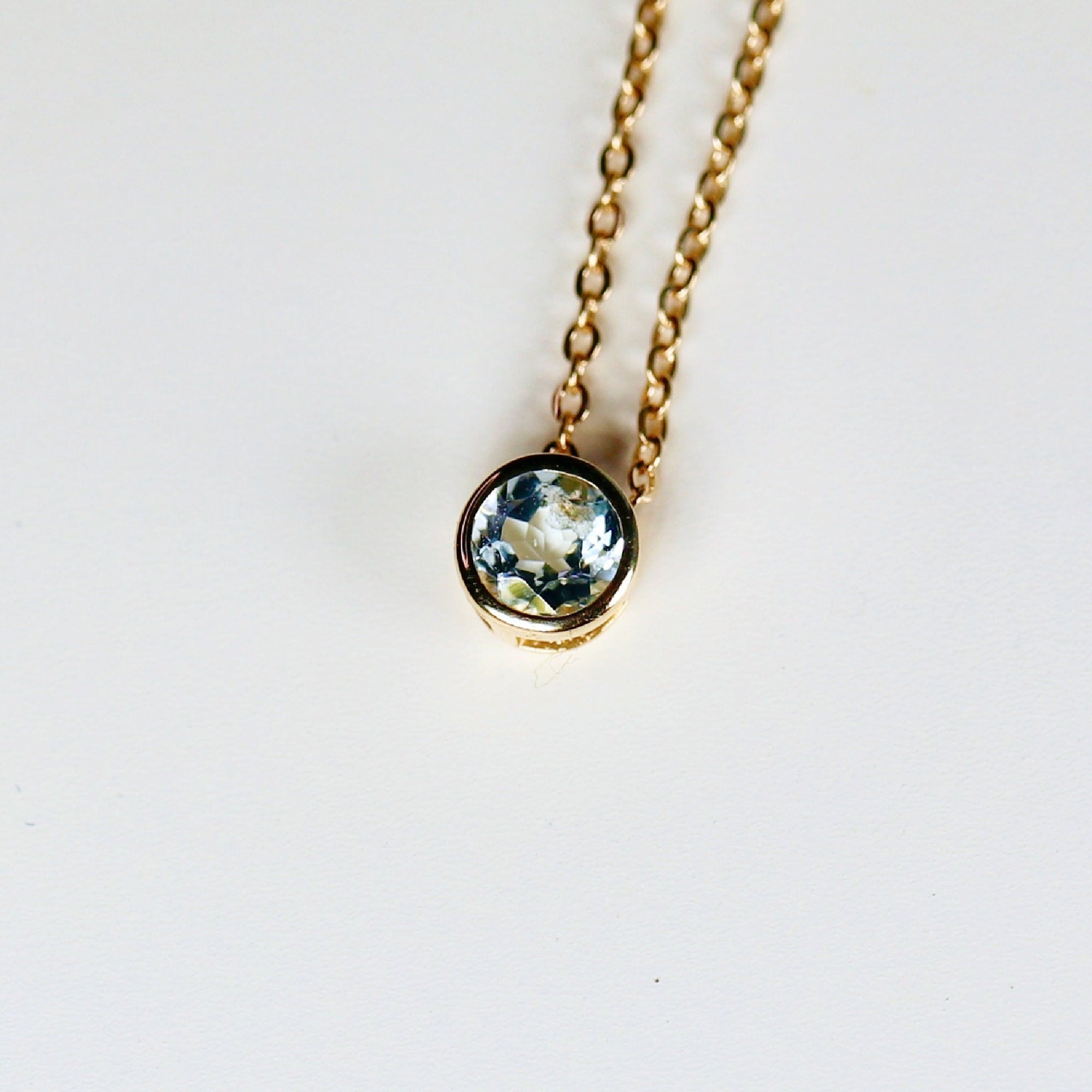 This 14k solid gold dainty minimal topaz necklace is bezel set and sliding style. Perfect Gift for Anniversary, Birthday or any Special Occasion to show someone you love them!