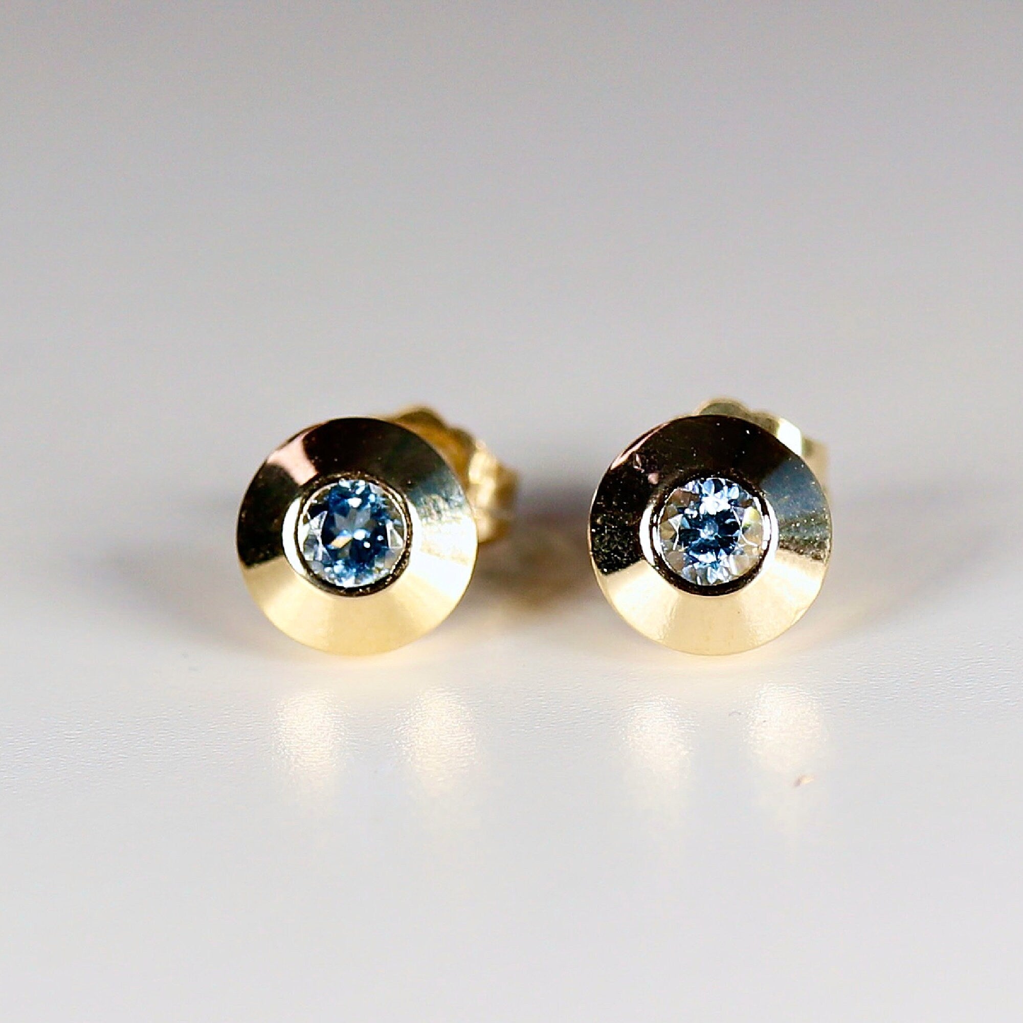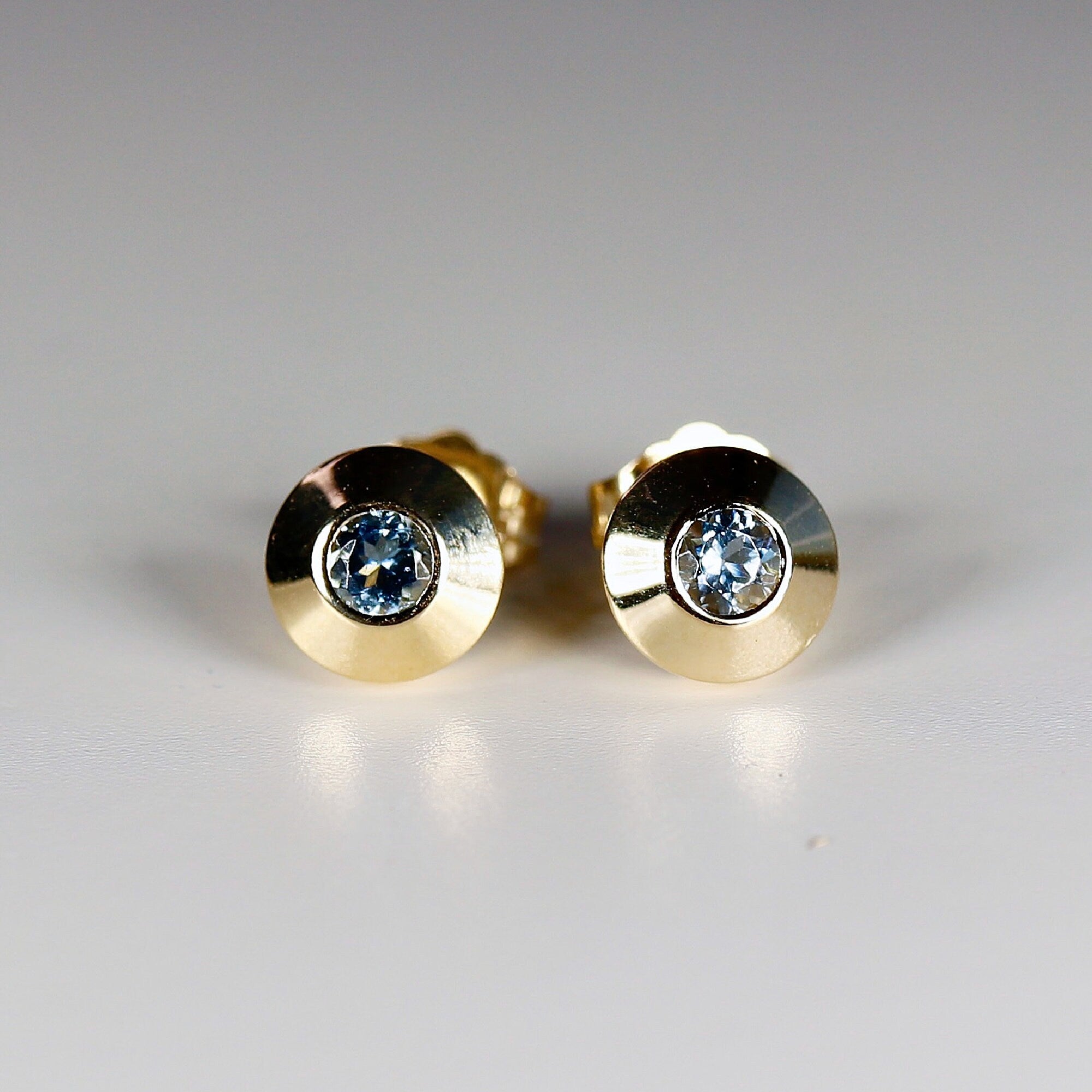 14k gold minimalist dome stud earrings. Bezel set 3.5mm aquamarines. Round shape, circle delicate studs. These dome circle earrings are post/stud style and included 14k solid gold butterfly backings.