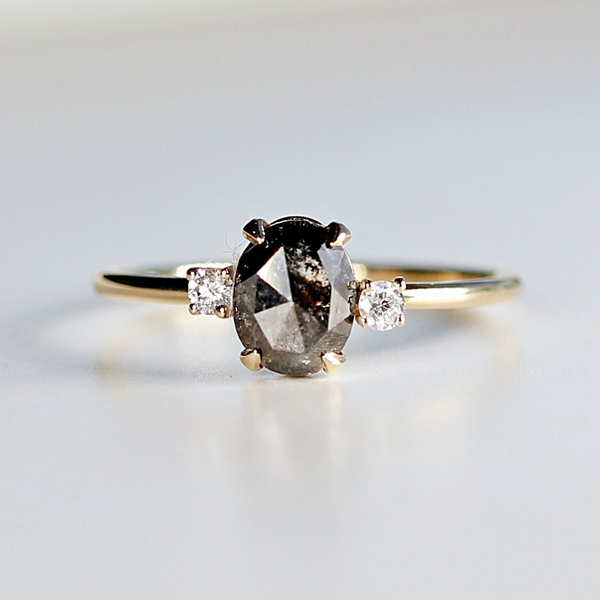 Oval Salt and Pepper Diamond Ring 14k Gold, Anniversary Gift