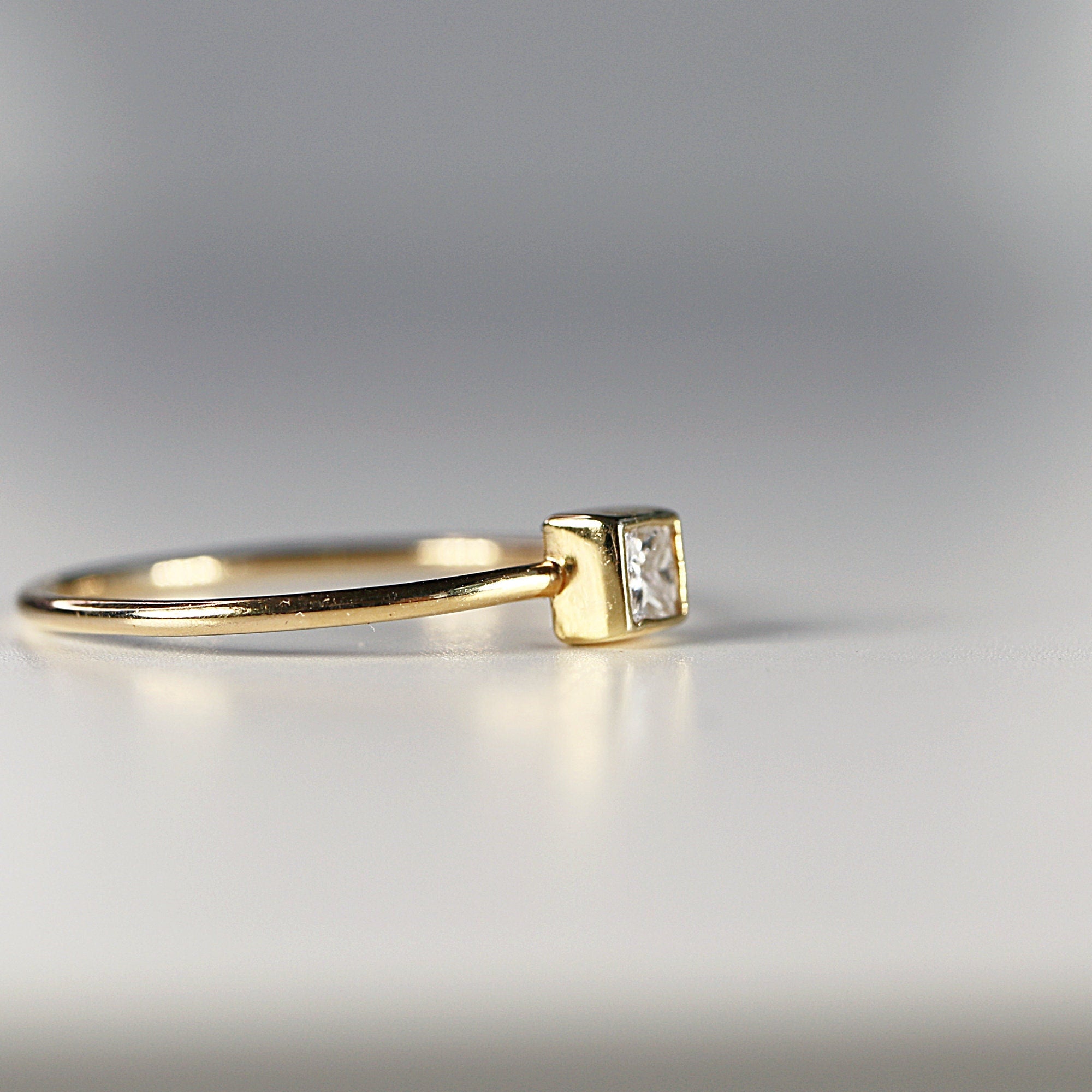 Our Handmade Dainty Diamond Ring is a timeless symbol of elegance. Expertly crafted with care and attention to detail, this ring features a princess-cut diamond on a delicate band, adding a touch of sparkle to any outfit. Perfect for stacking or as an engagement ring, its minimalist design captures the essence of love and beauty.